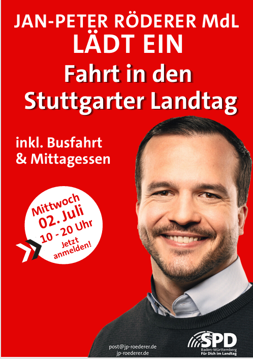 Jan-Peter Röderer, MdL, lädt herzlich alle Interessierte zur nächsten Besucherfahrt am 02. Juli in den Landtag in Stuttgart ein.
